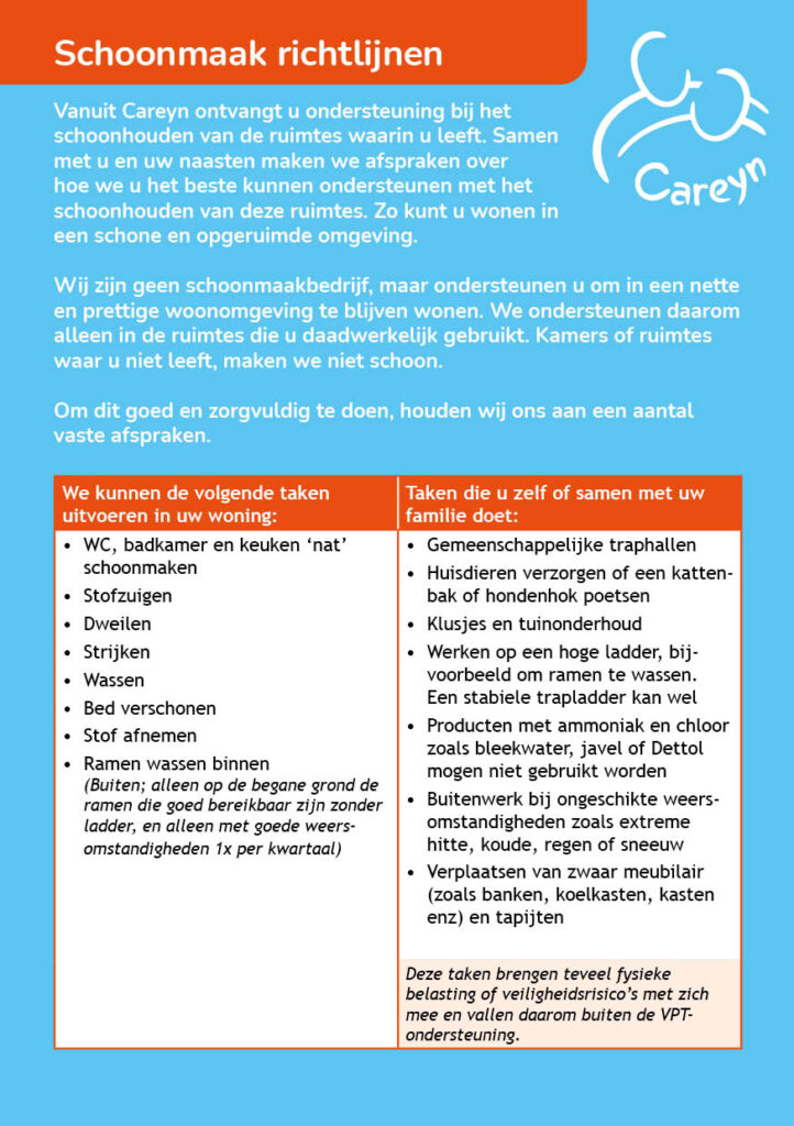 Schoonmaak richtlijnen, dubbelzijdige flyer A5.